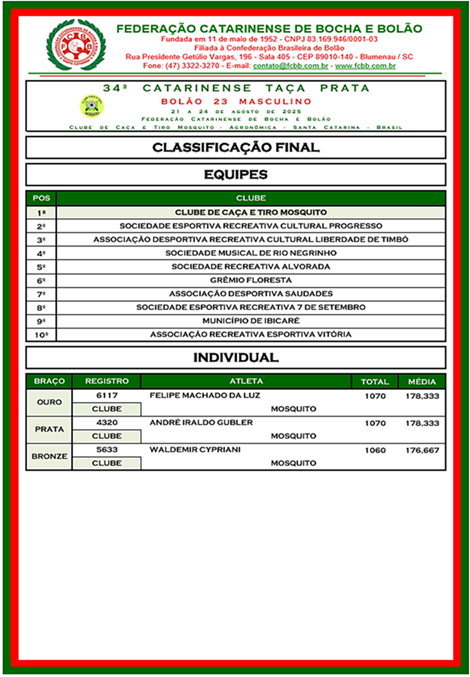 O título invicto reforça a tradição do Clube Caça e Tiro Mosquito no Bolão catarinense e valoriza ainda mais a cidade de Agronômica, que recebeu atletas, dirigentes e torcedores de diversas regiões de Santa Catarina.